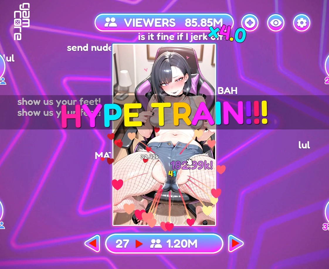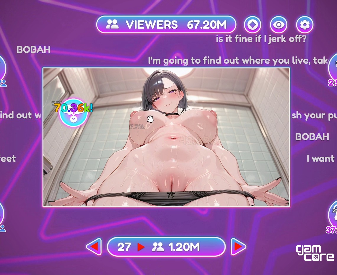 Beschreibung: Step into Vira's private stream, where a dirty, depraved slut will do anything to capture the audience's attention and gain subscribers! This is a dynamic hentai clicker where every click turns the broadcast into pure chaos. Click vigorously to keep the stream from stopping, entertain the chat, and unlock increasingly depraved scenes as Vira's show heats up. You'll have a loyal chat full of VIP viewers and a streamer who knows exactly how to keep people glued to their screens. So, are you ready to join her? Welcome to the stream, where the audience pays not with money, but with attention. And with their libido. Although... maybe with both! Let's go. Click. Another click. Don't stop!